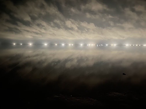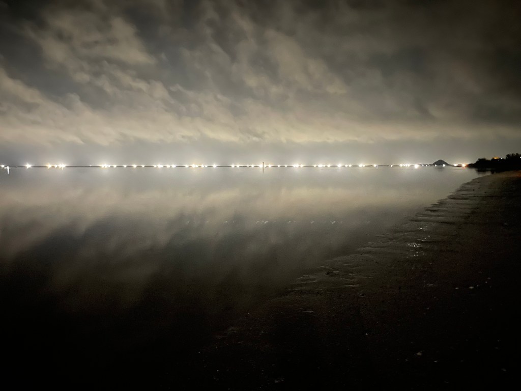 The other night, walking back from a restaurant down the lagoon, we thought there was fog rising off the water creating this very strange effect. It was not. The water was so calm that it was the reflection of clouds above, with all of the lights on the fishing boats lined up, lighting everything up in the strangest way. The string of lights are the boats, outside the reef, about a kilometer out from our beach. The boats are out there on any and every calm night when there is no wind. There is not much left of fish, unfortunately.