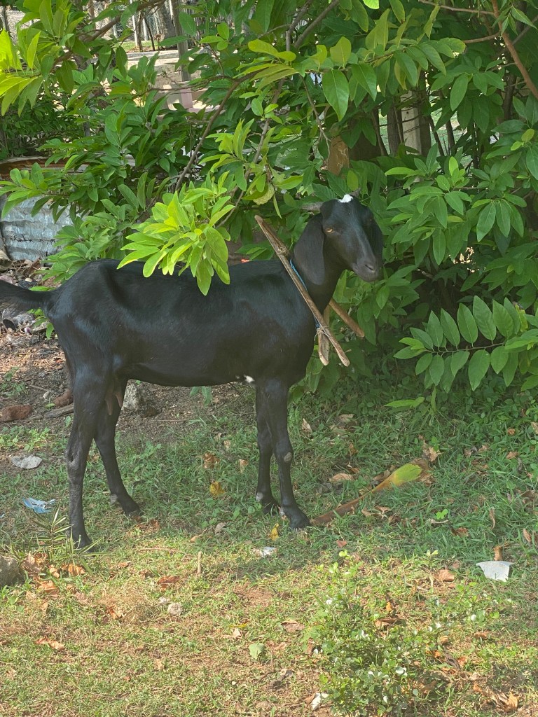 These free-range road goats are everywhere as well. They seem to have owners, but they are really left to their own devices. I usually just call them “picture frame goats” because they all have this triangular frame around their necks. The owners put the frame on them to keep them from sneaking through fences and destroying people’s yards and gardens. Those frames often get scarily close to the surfboard rack on our motorbike as we drive by, because the little buggers will barely move aside as you drive by.