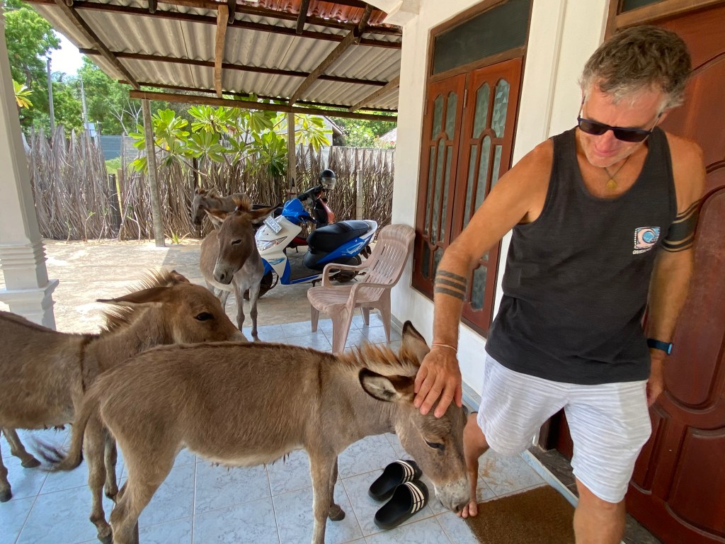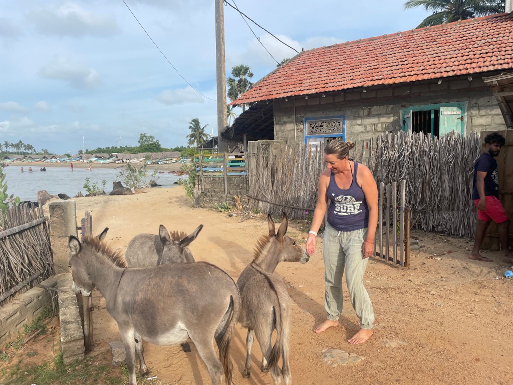 These are all wild donkeys, of their own subspecies, and they are protected by the government. No-one can capture them, or use them for domestic purposes. There are a ton of them. By last count there were over six hundred in Mannar alone, which is a small section of the area we are in. I heard estimates of as many as three thousand in total between Mannar, and where we are at in Kalpitiya. They are tough, scrappy little things, subsisting on the most meager feed and on the goodness of the local people. They are fed by many locals, and so have become very comfortable around people, both on porches or in the road. Or, in many cases, they can be found in the yard. With Tam.