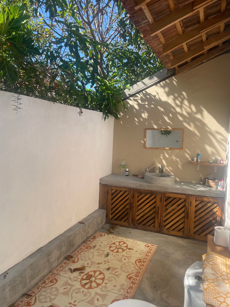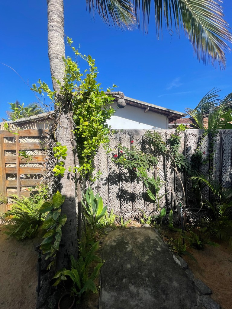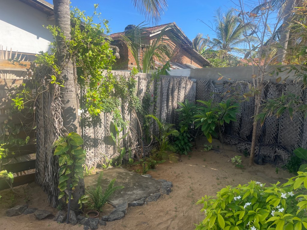 This one is great! A semi roof over the toilet so you don’t get wet while pooping (though it has only rained once in the three and a half months we have been in Sri Lanka), with the rest of the roof open. It allows for a beautiful breeze and really nice filtered sunshine. The wall is over head high for privacy with trees all around the outside. There is even a pomegranate tree directly over the toilet, and some vines have climbed over and hang out on the shower head.
