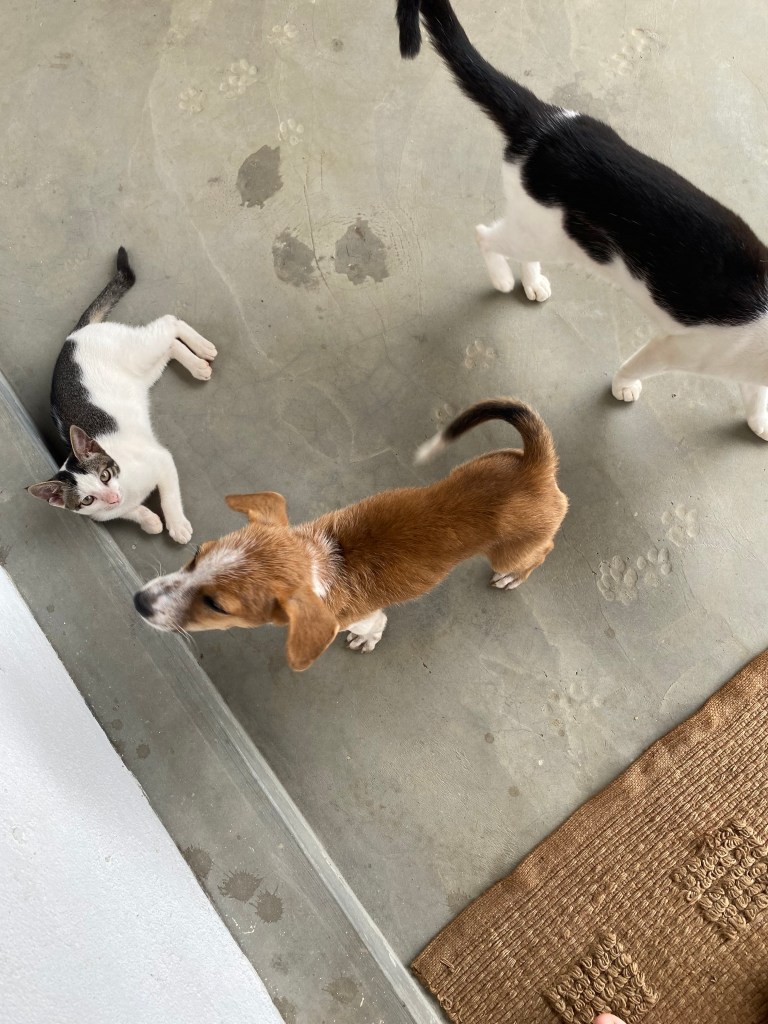 He is the bane of the cat’s existence though: constantly attacking them with his sharp little puppy teeth.