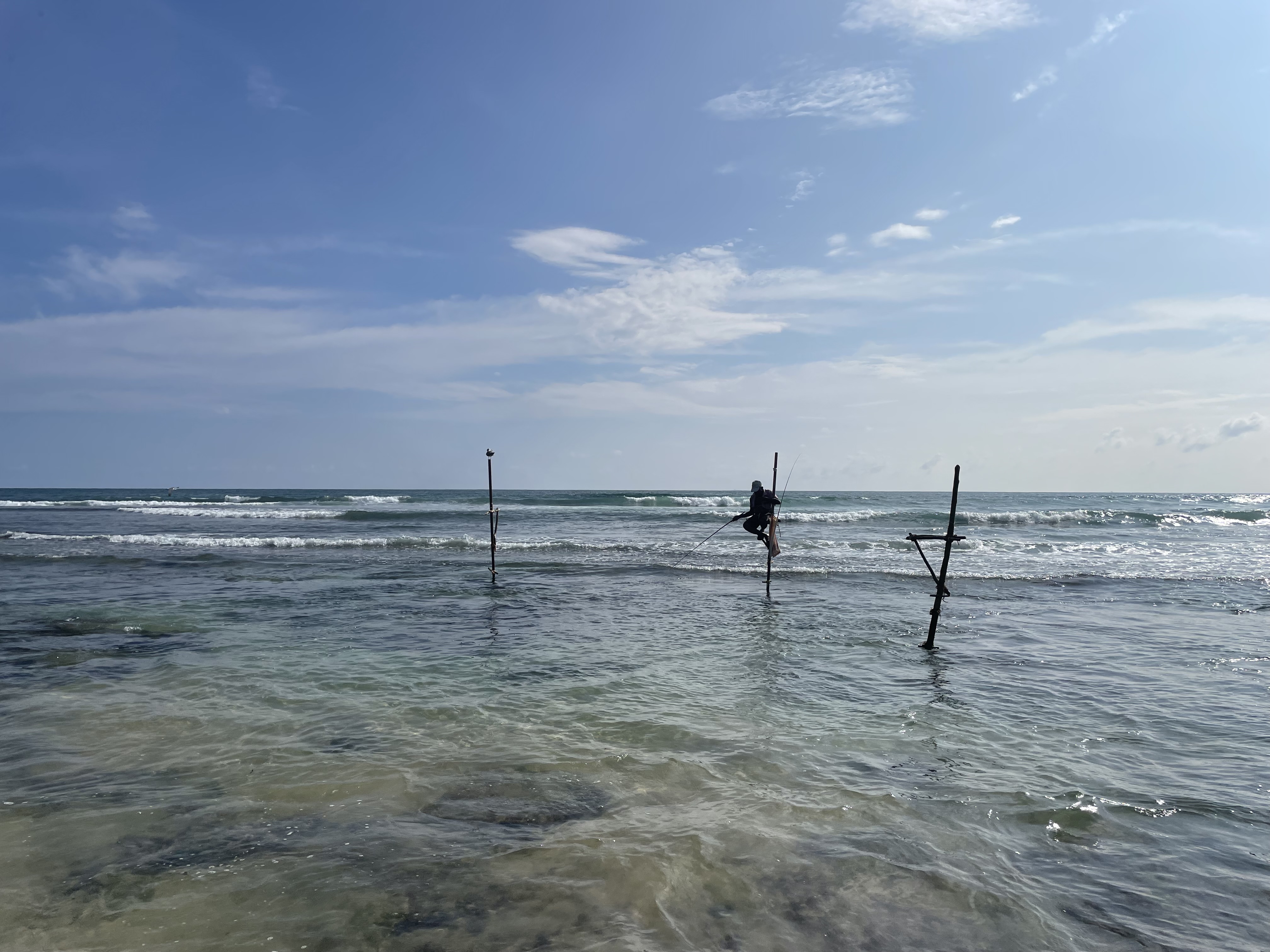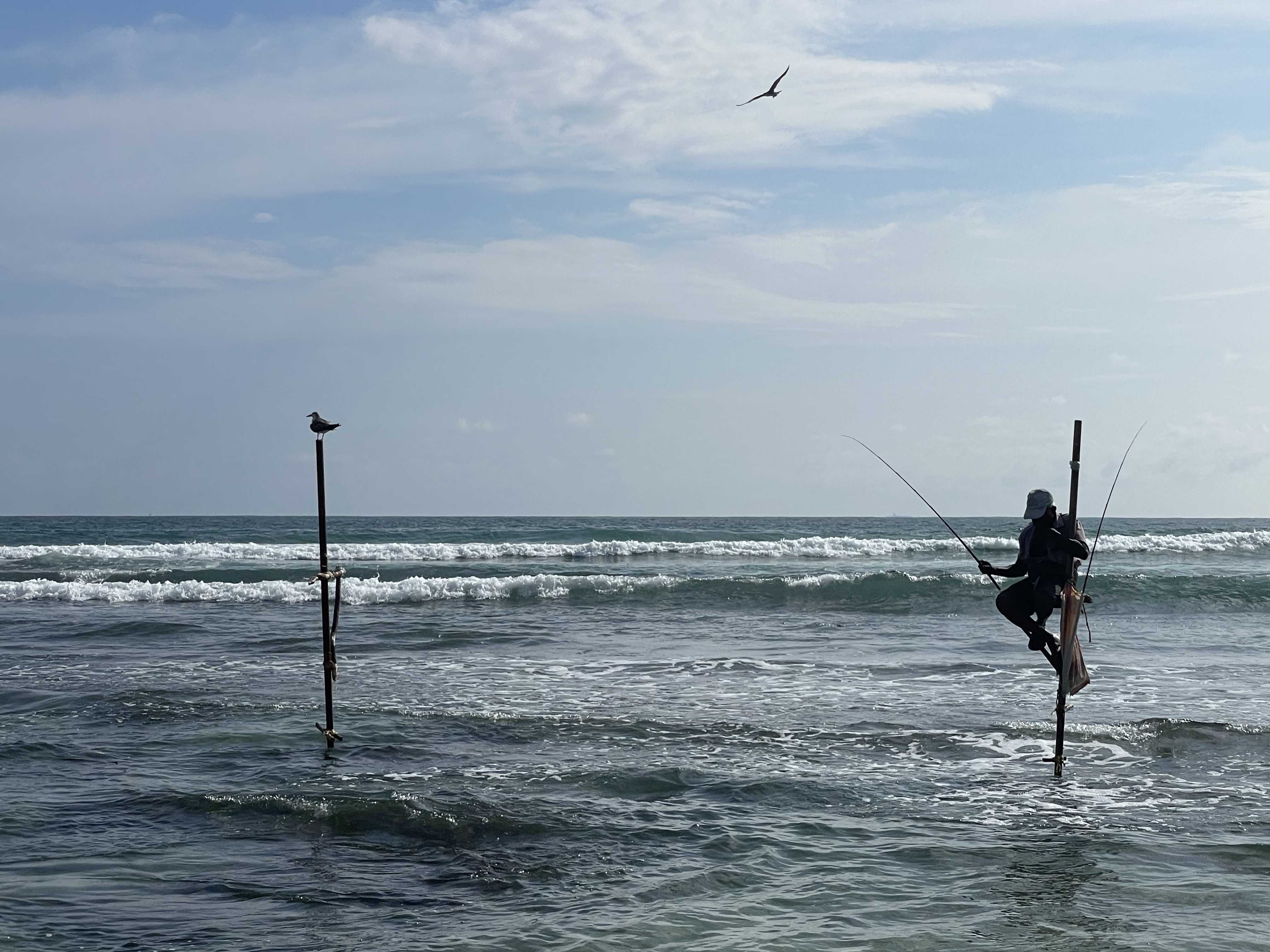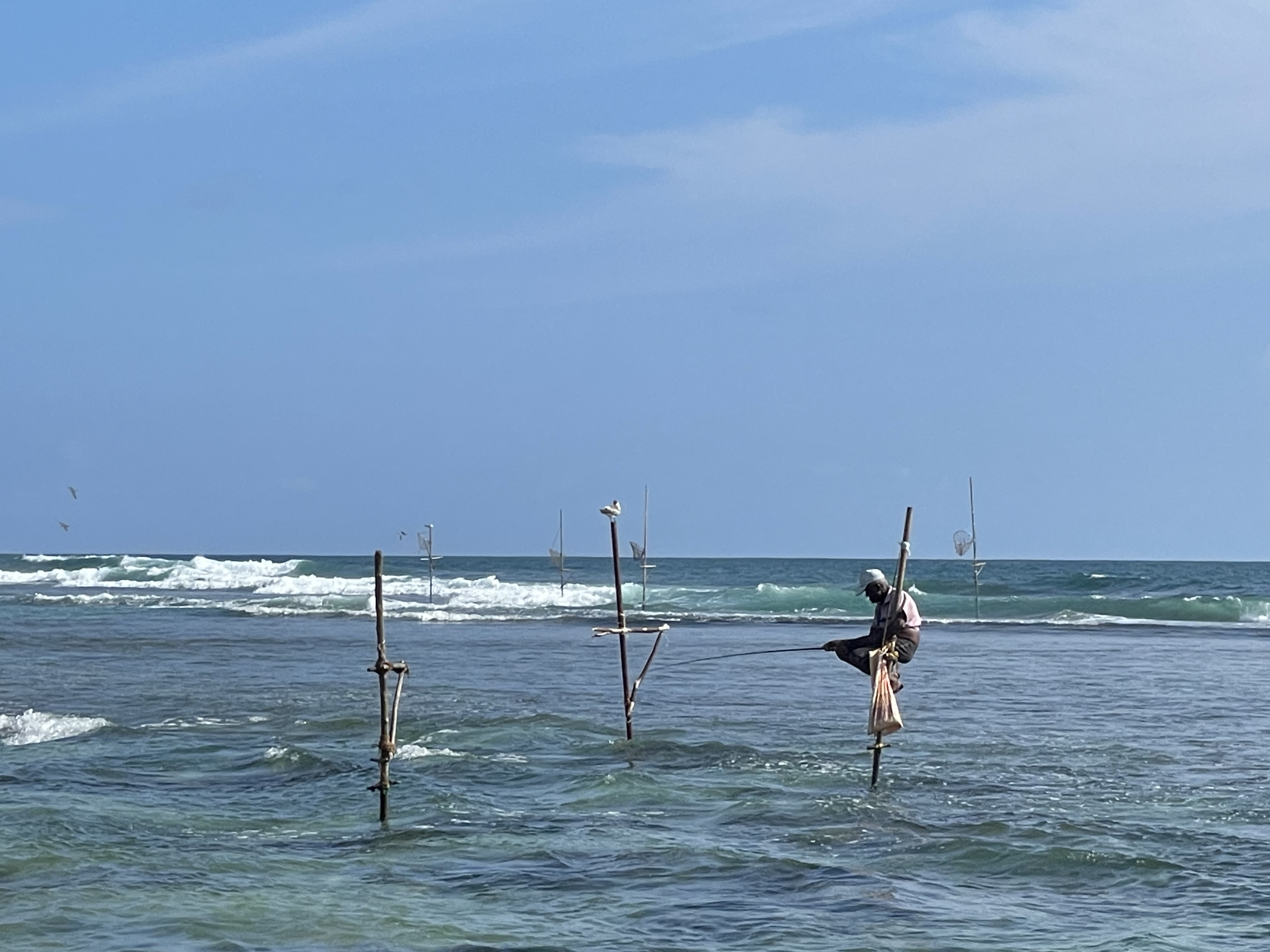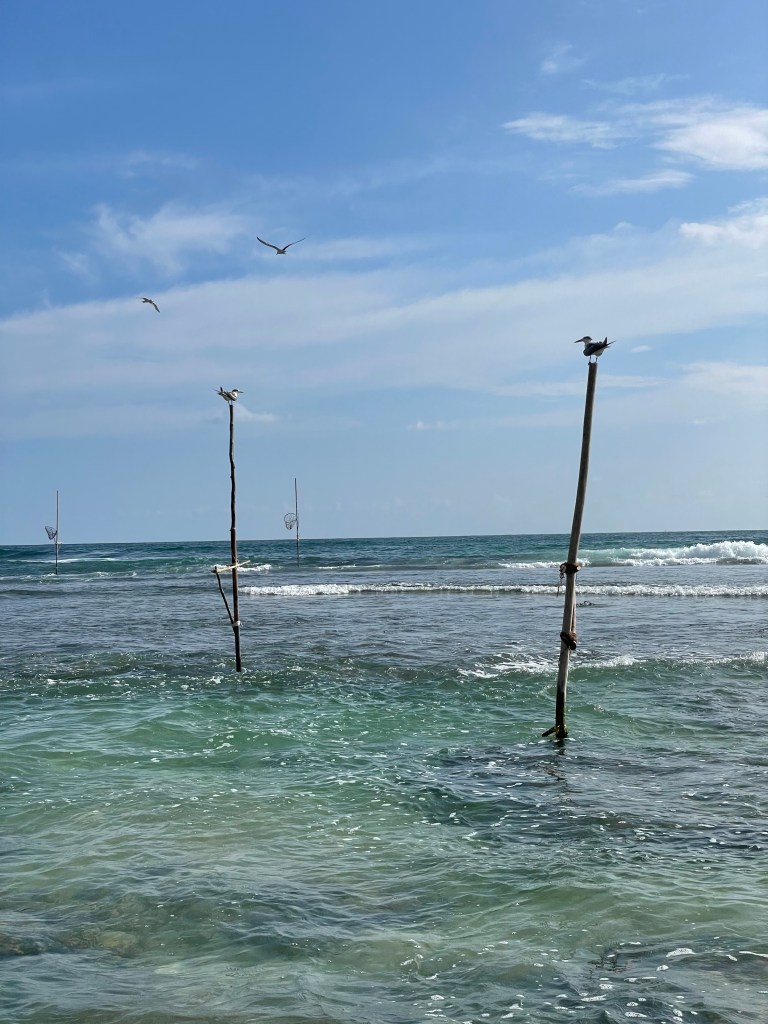 This is a traditional type of fishing here. These guys will sit on these sticks for hours on end, without moving. Most often there are a half-dozen of them sitting and chatting out there all day. Nobody is catching anything big, but I do see them bringing in small lagoon fish quite often. In many, less hidden, places along the main road it is also a tourist trap. They charge you a few rupees to go sit on the sticks (which, for tourists, isn’t actually in the water), and they will take a picture for you. Tam says we have to get one of those pictures before we leave. I don’t know.