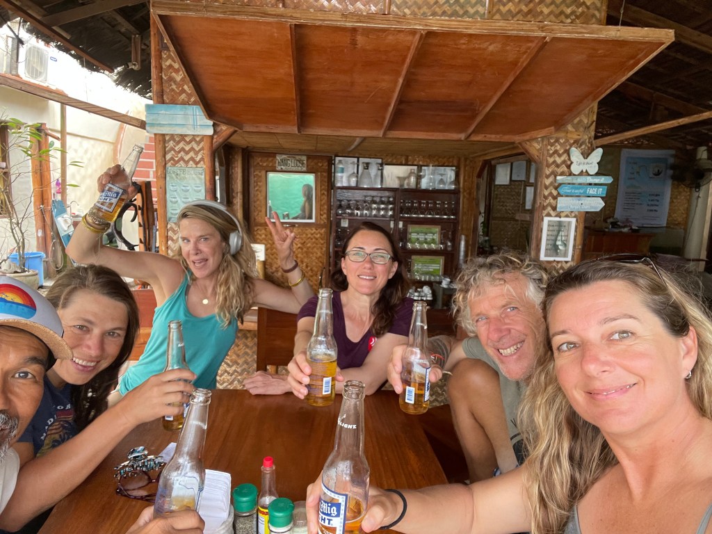 Chilling on the beach after a ripping day kiting and exploring islands by boat, and Milo and Nina enjoying giant Filipino beers afterwards at the Eastwind Resort in El Nido.
