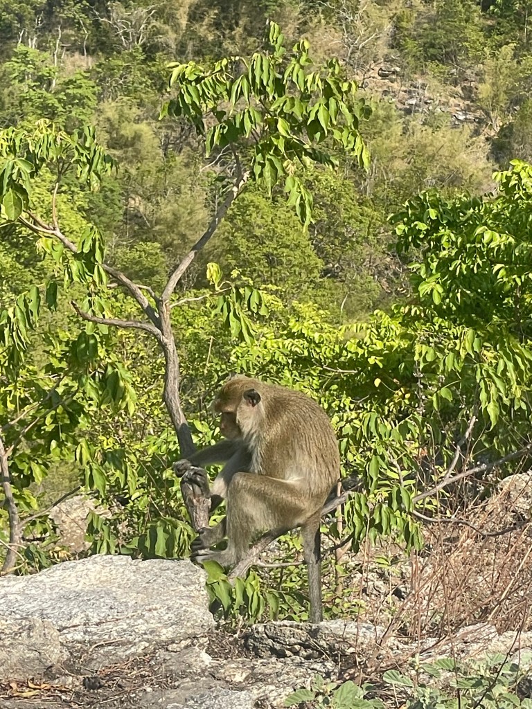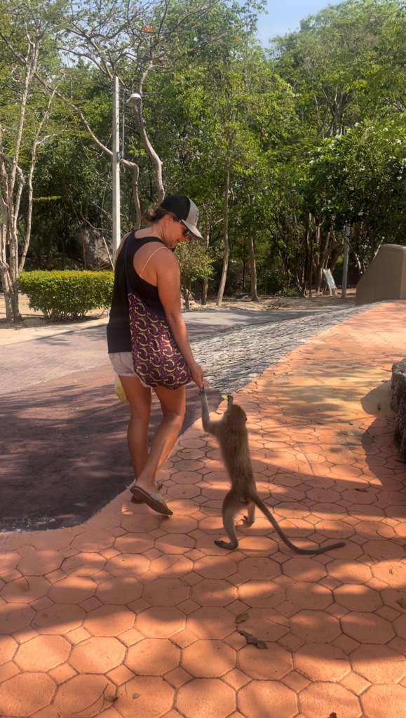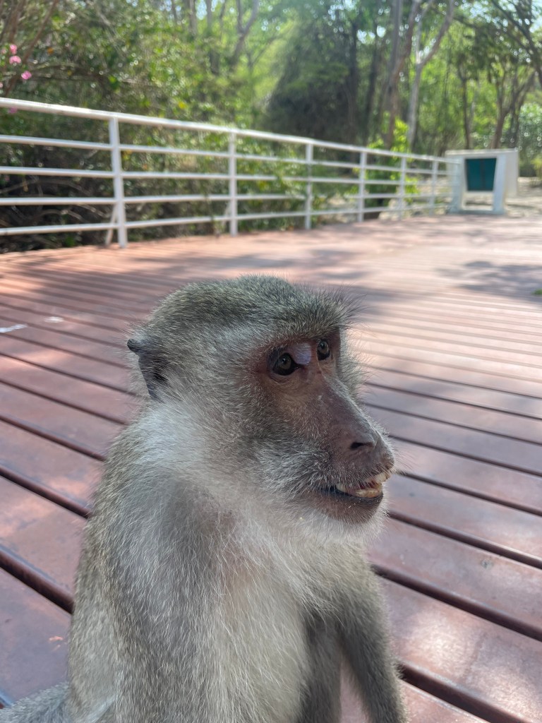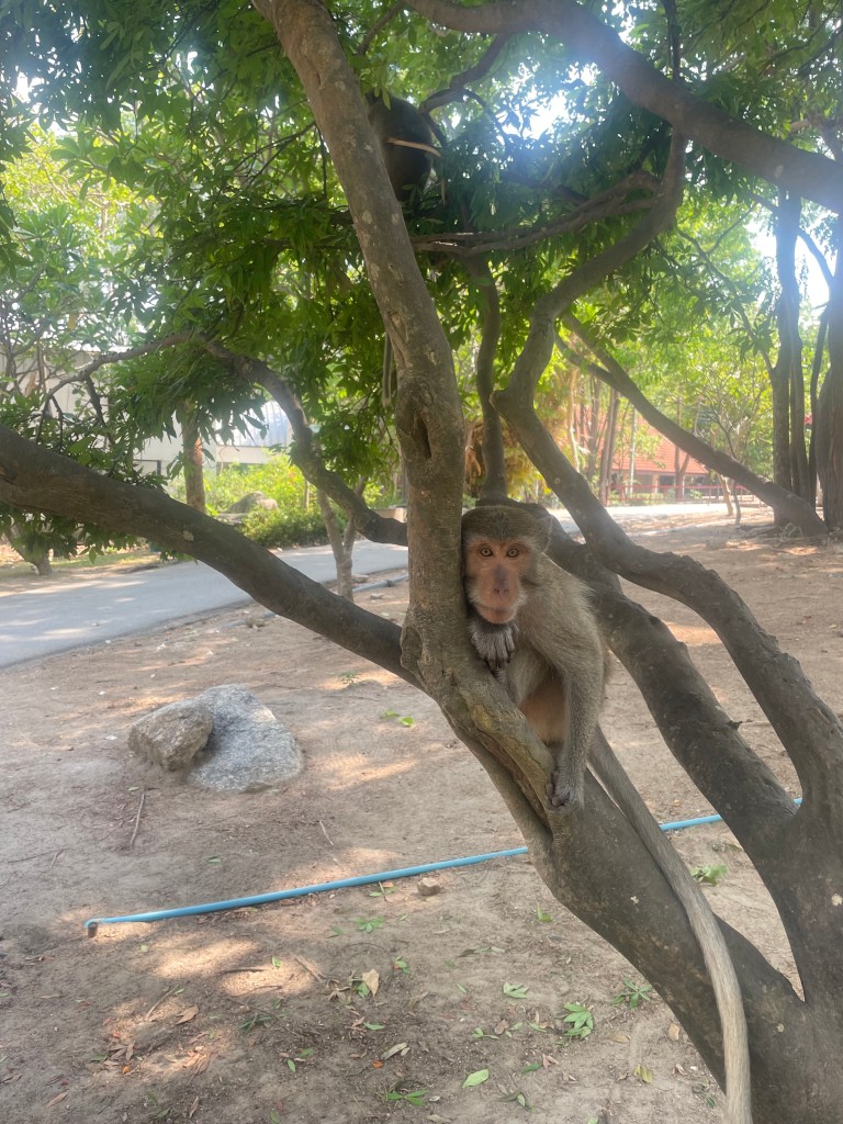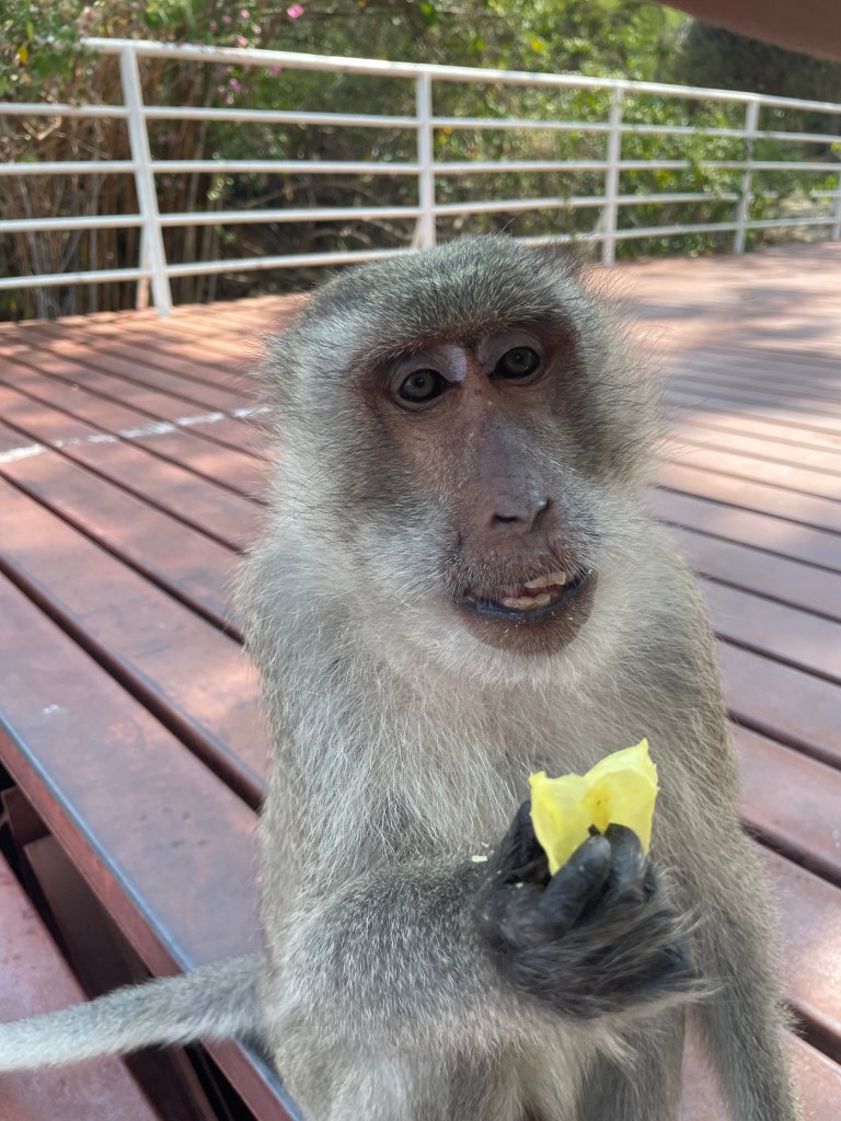 Last year I wrote a post called “Monkeying Around”, about some of the monkeys living around us here in Hua Hin. We have been back several times to Wat Takiap (or Monkey Mountain as it is more commonly known) to visit the temple there, even as it is protected by a pack of perverted little long-tailed macaques. Our friend Milo even had an ice cream cone stolen by one, and nearly lost his second ice cream to a surprise monkey ninja attack.