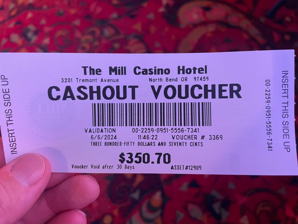 Of course, driving North up the coast means you have to pass a bunch of Casinos. I am not a gambler, but Tam and I have always stopped by one or another of them to give them our money. Normally we limit ourselves to one hundred dollars, but I always feel guilty if I lose that much (especially now that I am an old retired guy). Driving through Coos Bay, I stopped at the Mill Casino, checked my pocket for the twenty-seven dollars in cash I had in there, and decided to go in and try my luck. Tradition is tradition, yes?