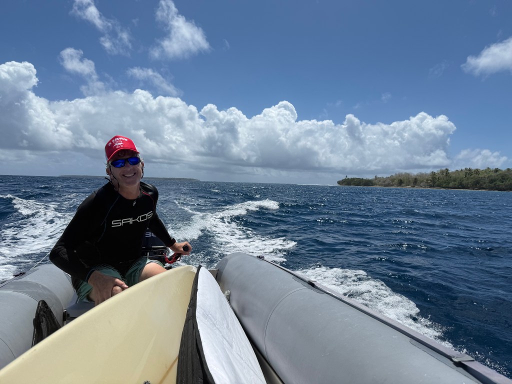 Here we are coming back from surfing “Mushballs” on Bigej Island, about 13 miles from Kwajalein. There is plenty of room for Tam and I, a nine foot longboard, and a six foot shortboard. With our little thirty-horsepower motor on there we can cruise along just fine.