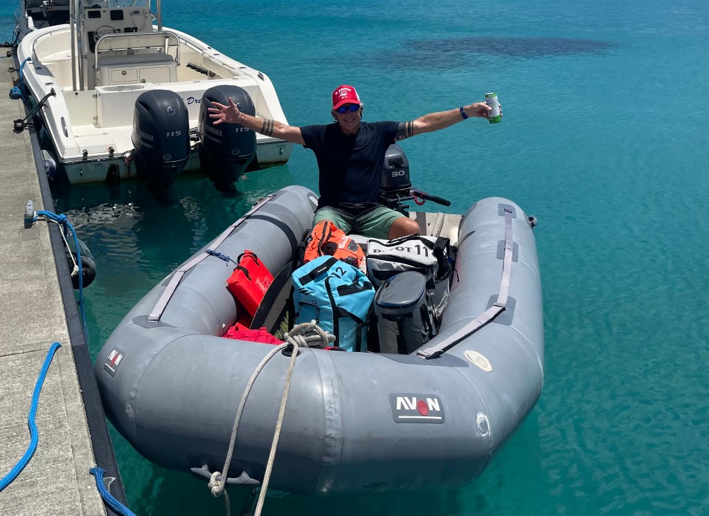 It (he) is an Avon 4.01 RIB. It is essentially a little thirteen and a half foot long, fiberglass-hull, inflatable-tube, zodiac.