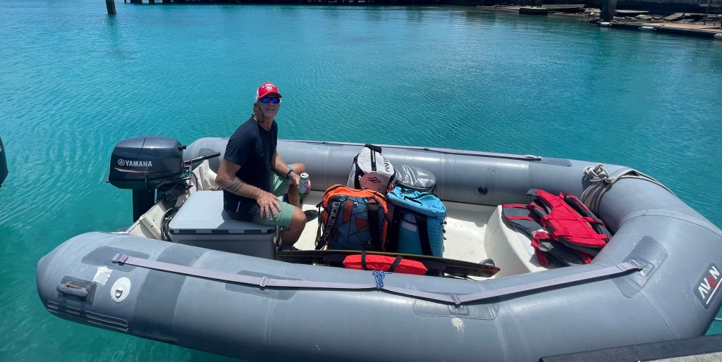 We can put four adults (skinny ones) in there, with kite gear and lunch, so he is just about the right size for our needs. He will get us around to a bunch of different islands within about twenty miles of Kwajalein, and to a bunch of different (better) surf and kiteboarding spots. We bought Patches about four months ago, but had been waiting two more months for our new Yamaha outboard motor to arrive from Majuro.