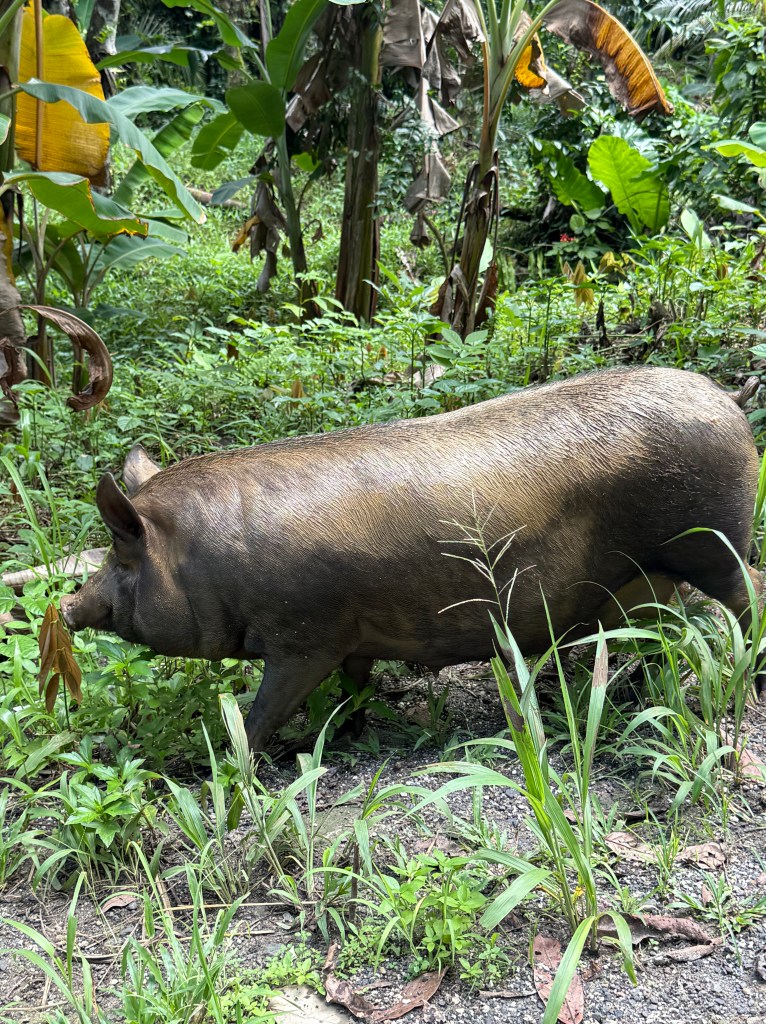 A perfectly proportioned, partially perturbed Pohnpeian pig, perambulating ponderously, possibly perusing a pasture for palatable protein. Probably particularly prefers the prenom Petunia.