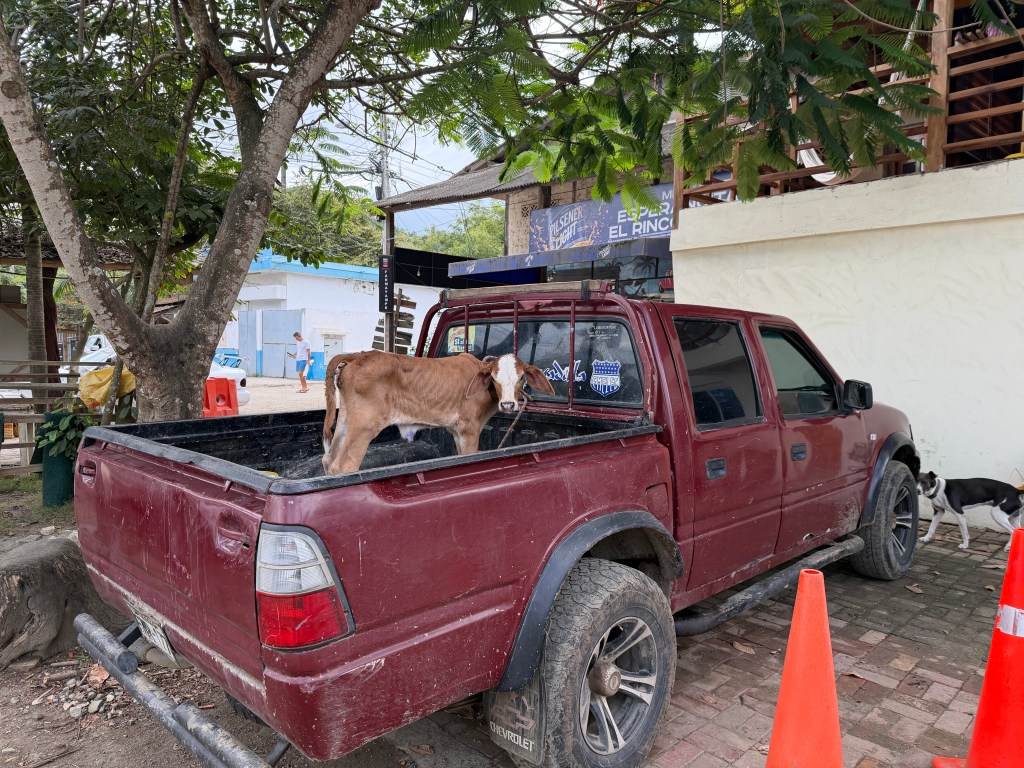 Some people let their dogs ride in the back of the truck. For others it is the family cow.
